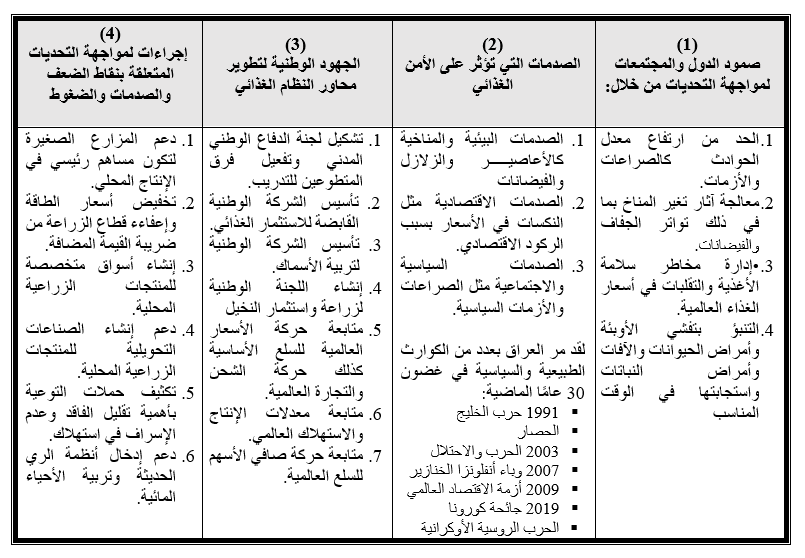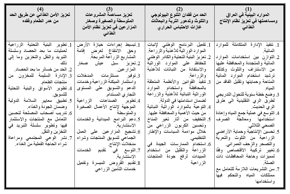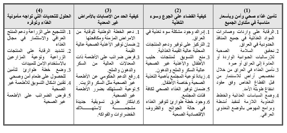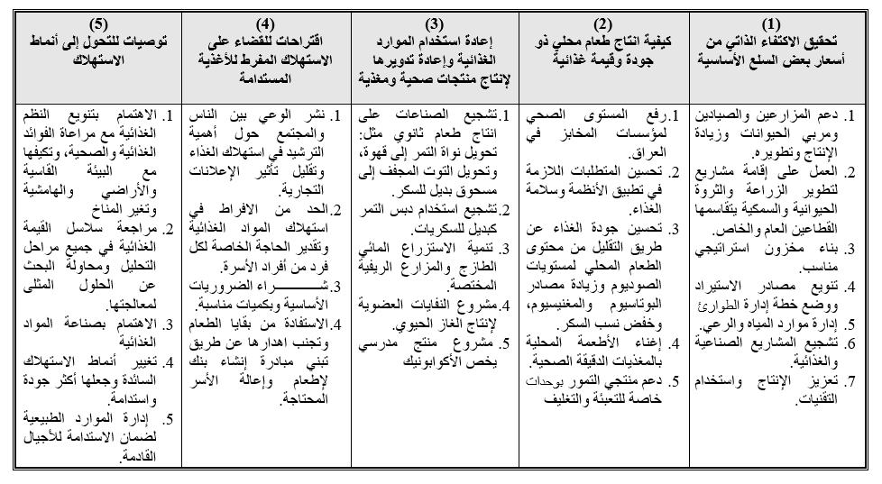 سلطت الحوارات الضوء على جميع التحديات التي يواجهها العراق فيما يتعلق بالنظام الغذائي. وقدم فريق حوارات النظام الغذائي من وزارة الزراعة بالتعاون مع منظمة الأغذية والزراعة وبرنامج الغذاء العالمي العديد من التوصيات/ الحلول التفصيلية في المجالات ذات الصلة مثل المياه، وتغير المناخ، وتسويق الإنتاج، والمحاصيل، والاستهلاك، والنفايات، والتلوث وغيرها. وعلى أهمية دور البحث العلمي في تطوير وتحديث النظم الغذائية أيضًا.