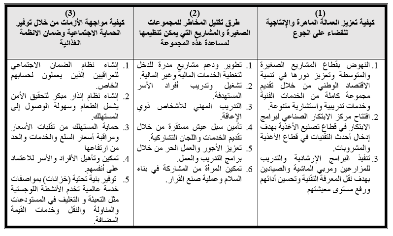 (2) خلق فرص العمل والتوظيف للشباب والمرأة: من خلال الشركات الناشئة وحاضنات الأعمال، وسلاسل إمدادات المدخلات الزراعية، وبرامج التأمين، ومراكز التعليم المتنقلة وغيرها.