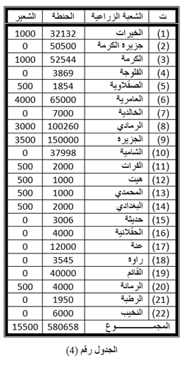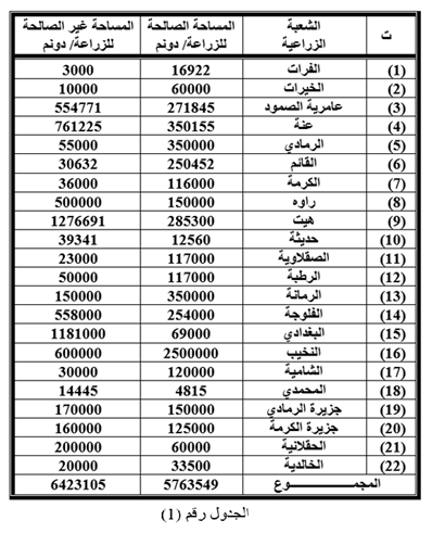 (4) الجدول من تصميم الكاتب، وهو يمثل إعادة تهيئة وتوضيح لجدول غير منشور صادر من مديرية زراعة الانبار يمثل المساحات الصالحة للزراعة وغير الصالحة بحسب الشعب الزراعية.
