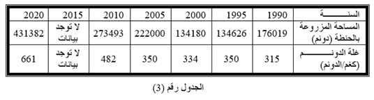 كما ان المساحات المزروعة بمحصول الحنطة قبل 2003 كانت قليلة نتيجة حروب الخليج وتجنيد اغلب الرجال في هذه المعارك، ثم ظروف الحصار الاقتصادي الذي فرض على الشعب العراقي، بعد غزو النظام السابق لدولة الكويت. ويبين الجدول رقم (3) المساحات المزروعة بمحصول الحنطة للفترة من 1990 وحتى 2020(6).