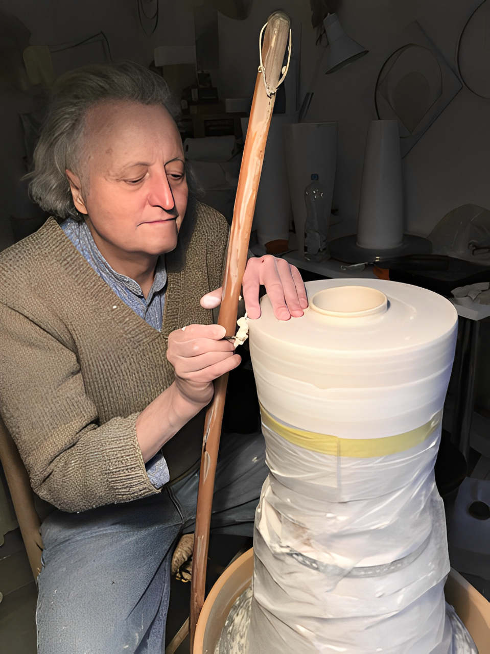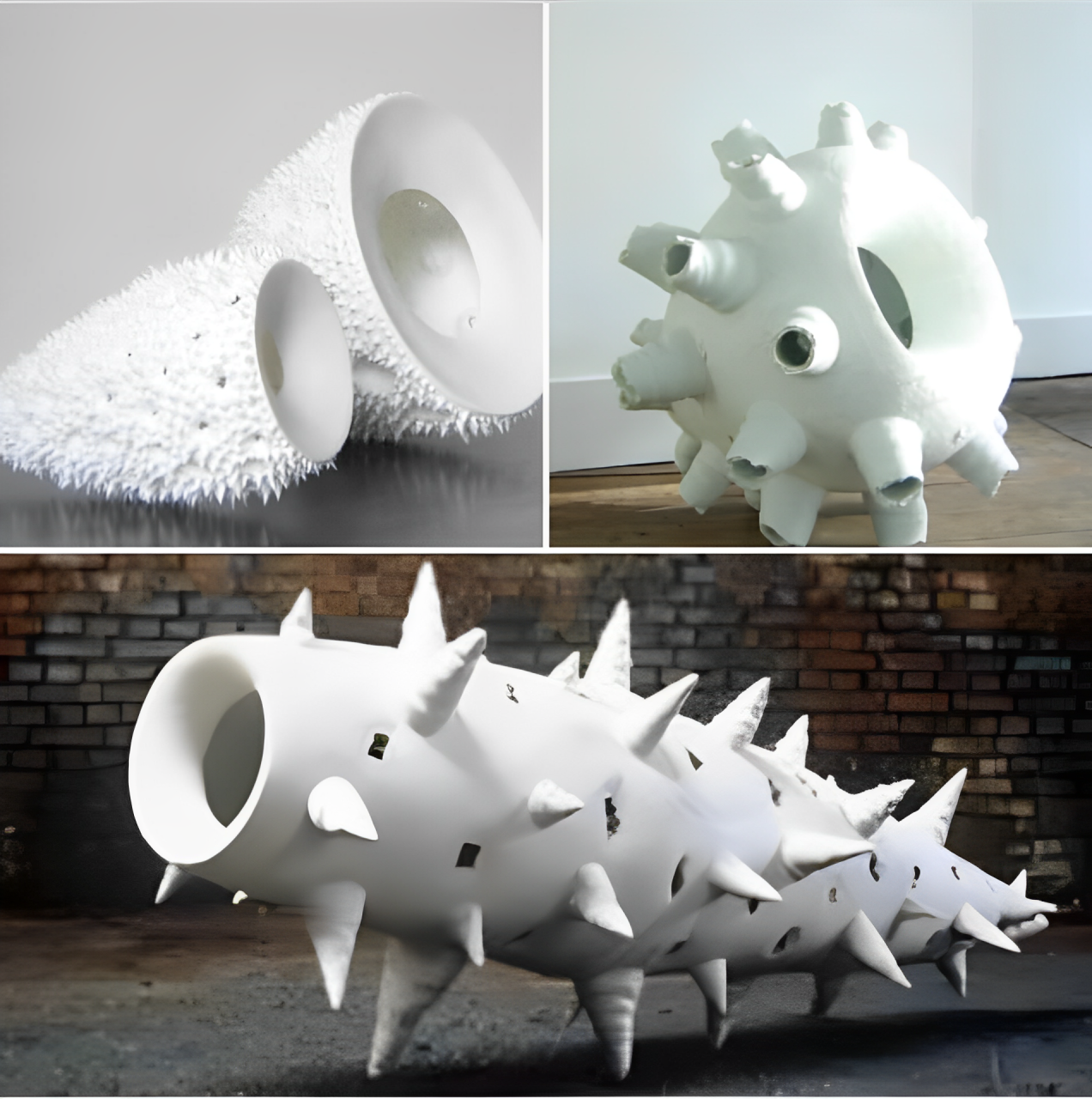 ان المادة هي اللامادية "غير الواقعية" للضوء، وإن أحدث الأشكال المخروطية المدببة المضيئة أو الأوعية الكبيرة الحجم، في روعتها الغريبة، تؤكد هذا الانطباع. ولكن هذا التجاهل للخزف تقابله فئة أخرى تثير الإعجاب بكبر حجمها، هياكل عظمية كلسية، كحيوانات عائمة صغيرة مجهرية، ملهمة، ملتوية حسيًا، مبنية، مجمعة، وغالبًا ما تكون منحوتات شائكة لها هيكل عظمي في شكل عضوي، في حد ذاته، لا حياة له، ولكنه ما يزال عضويًا..