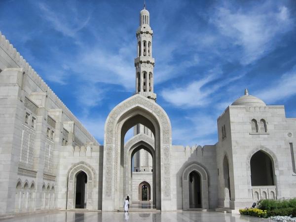 بني المسجد على ارض تحتل مساحة 416 ألف متر مربع، في مدينة مسقط عاصمة سلطنة عمان، ويمتد هذا البناء لتغطية مساحة منطقة من 40 ألف متر مربع، وهو مجمع صرحي متعدد الوظائف، ويمكن أن يكون هذا المشروع الأكثر نجاحاً للدكتور محمد مكية لقيمته ورمزيته وموقعه ومساحته، وبذخ ملكاته من خلال تداول نفيس المواد والتجهيزات، مثل الثريات والسجاد وأعمال الزخرفة والخزف الكربلائي كما يشير المعماري الدكتور علي ثويني في كتابه (عن سيرة مكية). وقد بدأ المشروع منذ عام 1992م وانتهى بافتتاحه في الرابع من أيار عام 2001م.