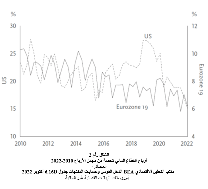 هناك مؤشر آخر على ضعف مركز قطاع المال. وهو انخفاض حصته من إجمالي الأرباح (الشكل رقم 2)(39). ففي الولايات المتحدة، انخفضت أرباح القطاع المالي من ذروة بلغت 27% في بداية عام 2019 إلى 15% فقط في الربع الثاني من عام 2022. أما في منطقة اليورو، فقد كان الانخفاض من 10% إلى 6%. على مستوى أعمق، تكمن "قوة قطاع المال" في السيولة، فهي أساسه كنشاط مستقل(40). ان السيولة تجسد ادعاء القطاع بتمثيل القيمة، وبقدرته على تأديب الوحدات الإنتاجية والجهات الفاعلة في الدولة عبر تأليب بعضهم ضد البعض. وبالتالي، كلما اتسع نطاق السيولة، أي كلما كانت الأسواق المالية أكثر مرونة وتكاملا، كلما كانت قوة قطاع المال أكبر. ان استنزاف السيولة في السياق التضخمي الجديد يؤثر على الهيمنة المالية أيضًا. وبالطبع، التضخم كندرة مالية، يتفاقم بفعل السياسة النقدية الأكثر تقييدًا.