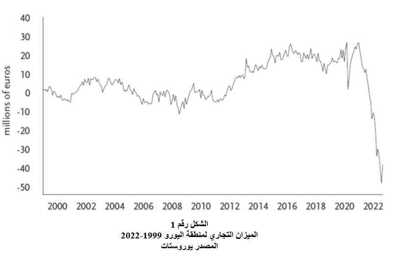 اما بالنسبة لأسعار الطاقة، التي كانت تقود التضخم حتى قبل غزو أوكرانيا، فقد كان لتدفق الوقود، في أسواق مشتعلة في ذلك الحين بسبب تحديات الانتقال الكاربوني(18)، آثارٌ بعيدة المدى(19). ثم تسبب فك ارتباط أسواق الطاقة الاوروبية القاسي عن روسيا بانعكاسات دراماتيكية على مستوى الأسعار، حيث تسربت التكاليف المرتفعة والريوع الانتهازية عبر سلاسل الإنتاج لتصل الى المستهلكين. بحلول أكتوبر 2022، كانت معدلات التضخم السنوية تبلغ 11.6% في ألمانيا، و12.6% في إيطاليا، وأكثر من 20% في دول البلطيق. إن التدهور المذهل في الميزان التجاري لمنطقة اليورو (الشكل رقم 1)، يُظهر ان ارتفاع أسعار الطاقة يشكل تكلفة على مجمل الاقتصاد الأوربي، بما يتطابق وشروط تراجع التجارة. أما نظراء هذا الواقع، فتتمثل بالفوائض القياسية التي سجلتها الدول المصدرة للنفط مثل المملكة العربية السعودية، وللمفارقة روسيا.